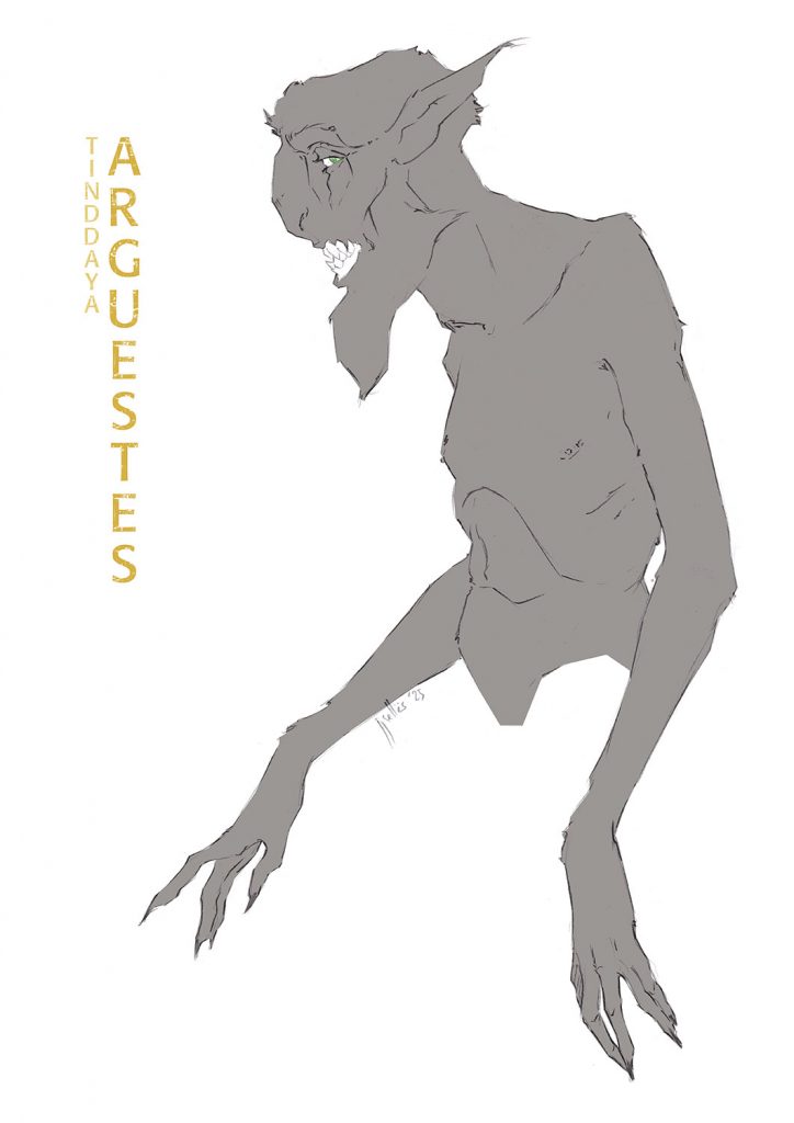 La carrera de Arguestes se hace eco a medida que se acerca, el peso de sus zarpas retumban contra el asfalto. Es completamente negro, con pelo cano, de ojos verdosos, el rostro es mucho más salvaje, los dientes prominentes desdibujan el labio, la nariz torcida.